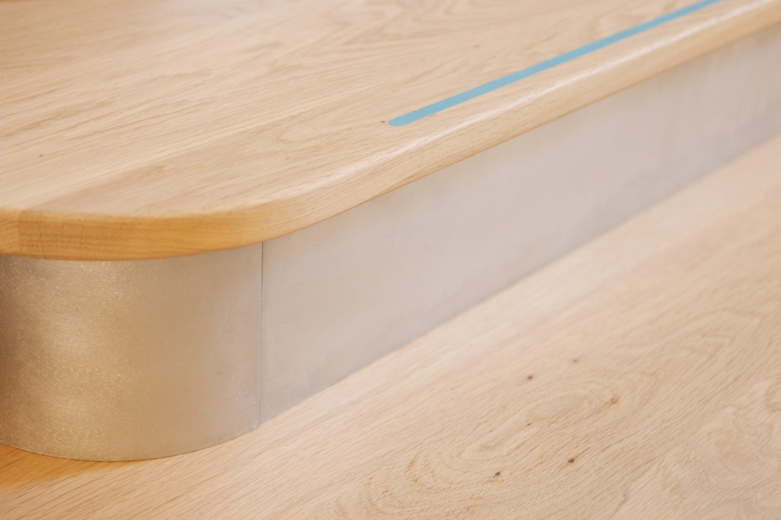 Matériaux :Chêne, Zinc, laque bleu et vernis hydro Habillage en chêne et zinc, d’un escalier en béton.